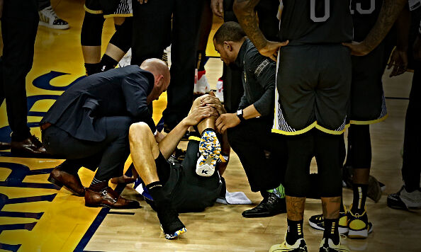 Toward the end of the third quarter of Thursday night’s Game 6 in Oakland, Klay Thompson landed awkwardly after he was fouled on a breakaway layup by Danny Green, and appeared to badly mess up his left knee. Klay had already missed a game in this series with an injured left hamstring; the Warriors of course were playing without Kevin Durant, Kevon Looney was playing with fractured chest cartilage and DeMarcus Cousins was still recovering from a quad injury.
