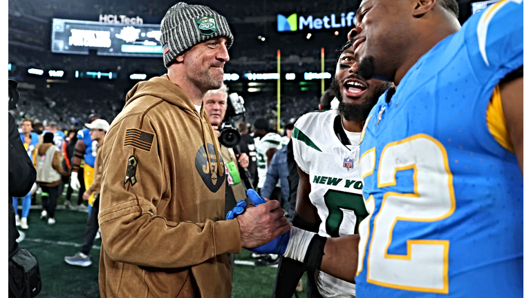 A clip shared by ESPN's Adam Schefter hours before his appearance on McAfee's show showed Rodgers embracing James after the Jets' 27-6 loss to the Chargers Monday (November 6) night and saying he was "a few weeks" away from playing again, despite the projected season-ending injury, when James asked about his recovery.
