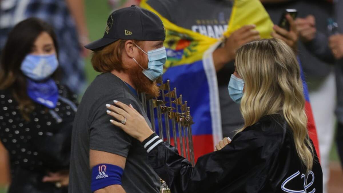 The COVID test results shockingly led to Turner being led away from the Dodger dugout right before the 8th inning. Later, during the trophy celebration however, JT came back onto the field to have a few minutes of joy with his teammates and wife for the team photo. This sent a lot of people on the internet into a tizzy.