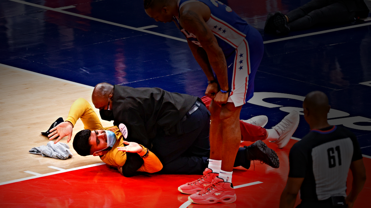 A man was tackled and apprehended after running on the court during the Philadelphia 76ers-Washington Wizards game on Monday (May 31) night, which served as the latest in a string of recent incidents involving bad behavior by fans during the NBA Playoffs.