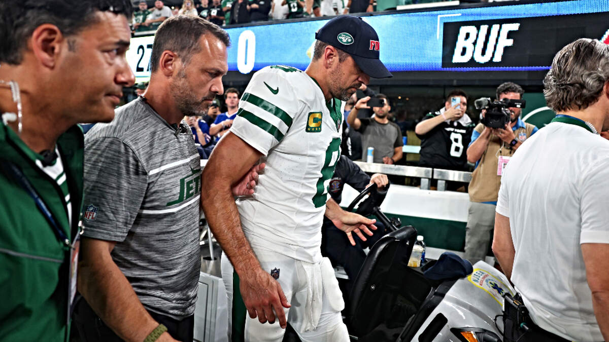 Rodgers was carted off the field and brought into the Jets' locker room and seen wearing a boot on his foot after exiting the team's X-ray room, which NFL Network's Ian Rapoport said was "an indication his night is over." Monday Night Football play-by-play man Joe Buck had initially said Rodgers was reported to have suffered an ankle injury and his status was "questionable" prior to officially being ruled out.