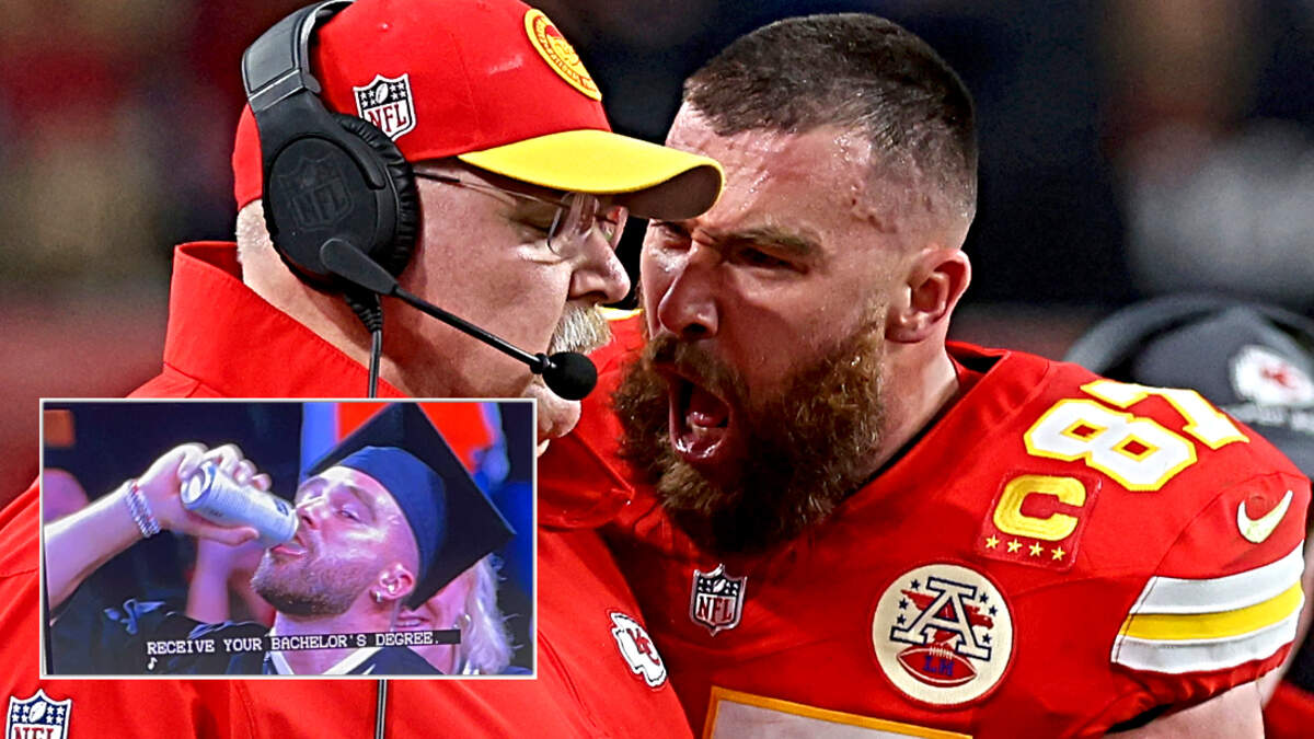 Kansas City Chiefs tight end Travis Kelce celebrated receiving his diploma by chugging a beer on stage during a special 'New Heights' podcast live episode at his alma mater, the University of Cincinnati, Thursday (April 11) night.