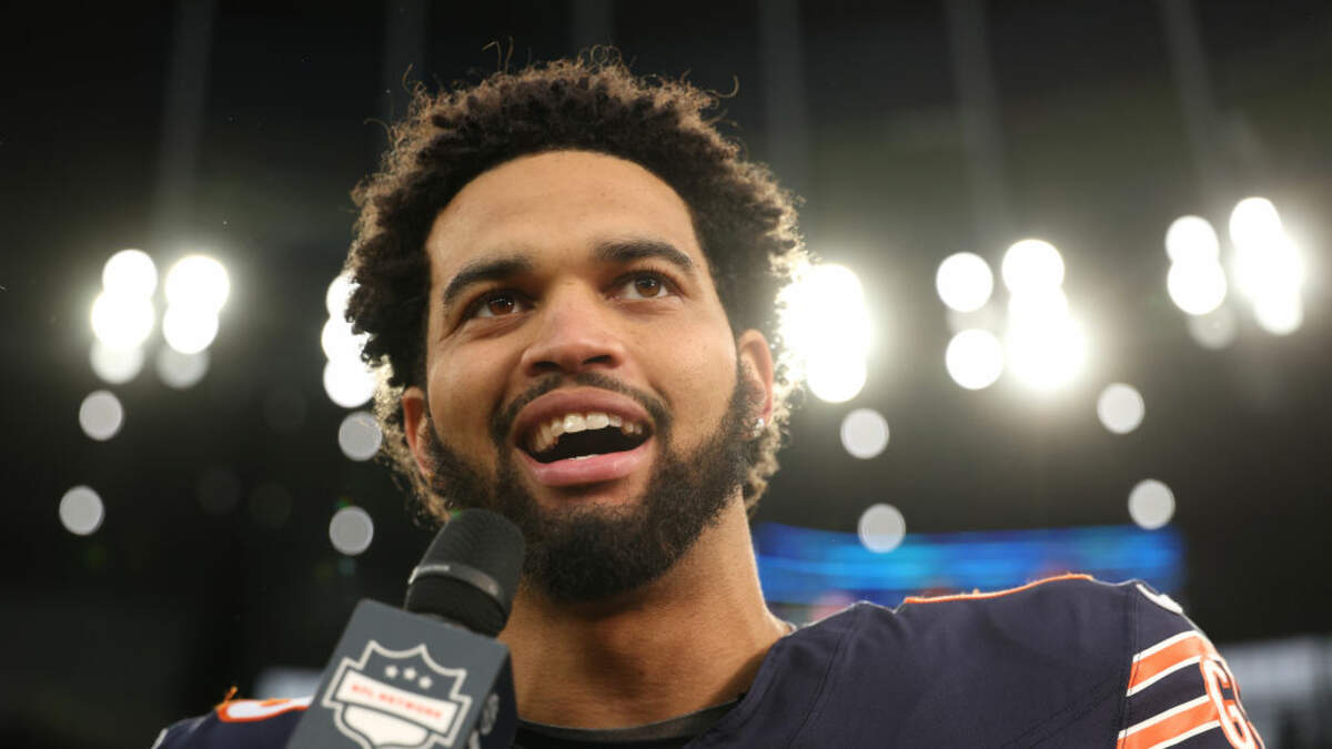 LONDON, ENGLAND - OCTOBER 13: Caleb Williams of Chicago Bears gives a post match interview during the NFL match between Jacksonville Jaguars and Chicago Bears at Tottenham Hotspur Stadium on October 13, 2024 in London, England. (Photo by Richard HeathcoteFoto: Getty Images Europe